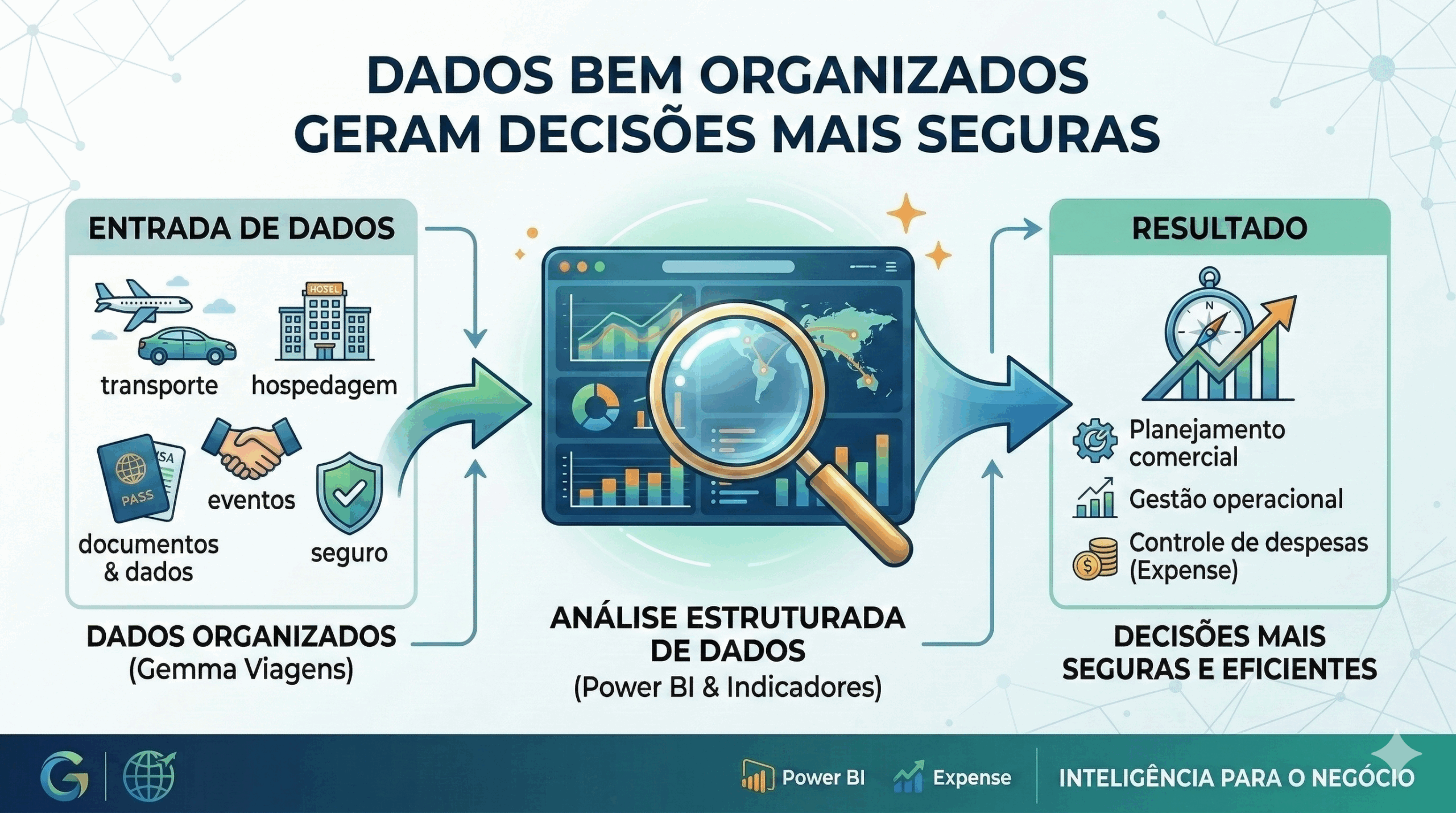 A Gemma Viagens faz a conciliacao de fatura e integracao de dados gerenciais, simplificando o processo financeiro e melhorando a gestao dos gastos.
